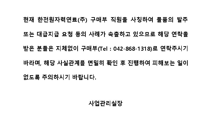 "★ 긴급 공지 ★ 한전원자력연료 직원 사칭 관련 공지 사항" 상세보기 ★ 긴급 공지 ★ 한전원자력연료 직원 사칭 관련 공지 사항 작성자 KNF 게시일 2025-11-14 조회수 161